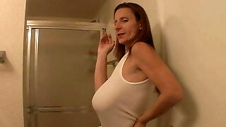 Classic busty porn queen sucks huge beefstick in the shower then fucks