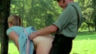Blonde hotty gets screwed from behind in a forest in retro vid