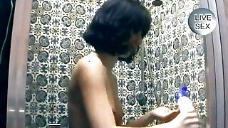 Dark haired beauty from Germany pleasing her puss after a shower