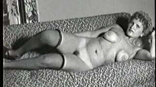 Busty babe strips off retro lingerie toys wet pussy in nylon