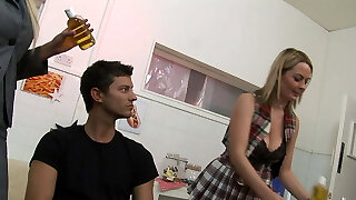 Hefty-titted German chicks gets fucked by two dude's in the kitchen